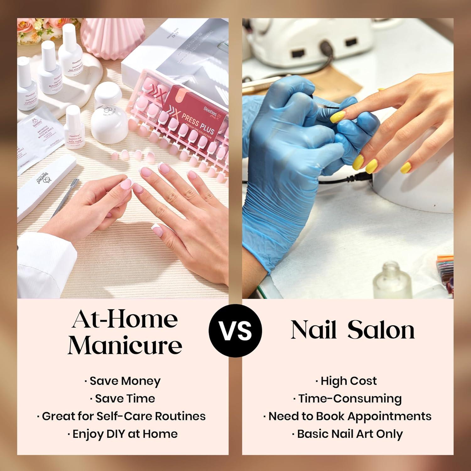 【Save Money And Time】Beetles short press on nails has pre-designed seven distinct classic Christmas nail art styles, making it easy to perfectly replicate the quality of a salon level manicure at home, saving you time and money!(Please note: Due to product upgrades, the light cord and quick-drying adhesive may come in two different packaging options, but their functionality remains identical. No need to worry.)